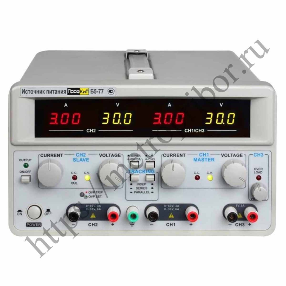 Источники питания ПрофКиП Б5-77 предназначены для питания стабилизированным напряжением и током узлов, и схем радиоэлектронной аппаратуры, при проведении работ в процессах наладки, ремонта и лабораторных исследований. Источники питания отличаются от аналогичных моделей малым уровнем шумов и пульсаций выходного напряжения и тока. Приборы включены в государственный реестр средств измерений РФ и допущены к применению в сфере метрологического контроля.