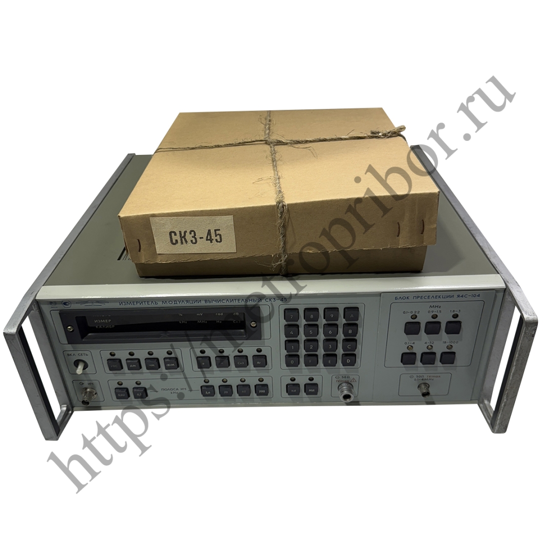 Диапазон частот: 100 кГц-1000 МГц, (до 10 ГГц со сменным блоком Я4С-103), АМ, ЧМ, ФМ, КОП, микропроцессорный, П-490х175х480, М-17,5кг. Для оперативного измерения модуляционных параметров сигналов связной и измерительной аппаратуры и применяются на объектах сферы обороны, безопасности и промышленности. - напряжения входного сигнала; - коэффициента АМ; - девиации ЧМ сигнала; - девиации ФМ сигнала; - частоты модулирующего сигнала; - коэффициента гармоник модулирующего сигнала.В измерителе модуляции СКЗ 45 предусмотрена возможность работы со сменными блоками Я4С-103 и Я4С-103А, предназначенными для расширения диапазона частот входного сигнала. Измеритель модуляции вычислительный СК3-45 может быть использован в качестве прецизионного демодулятора АМ или ЧМ сигнала. Измеритель модуляции вычислительный СК3-45 может использоваться в автоматизированном режиме по каналу общего пользования (КОП) и автоматизированных измерительных системах (АИС). Описание измерителя СК3-45 Принцип действия измерителя модуляции СК3-45 основан на измерении амплитудного или среднеквадратического значения продетектированного сигнала, пропорционального модуляции. Прибор построен по принципу супергетеродинного приемника. Входной сигнал преобразуется в промежуточную частоту стробоскопическим преобразователем частоты. Настройка на частоту входного сигнала осуществляется автоматически с помощью схемы автоподстройки, которая осуществляет перестройку гетеродина до тех пор, пока частота преобразованного сигнала не будет равна номинальному значению промежуточной частоты. Сигнал промежуточной частоты поступает на высоколинейные амплитудный и частотный детекторы. Низкочастотный сигнал с выхода частотного или амплитудного детектора детектируется пиковым или среднеквадратическим детектором и преобразуется в цифровой код. Значение измеряемой величины отображается цифровыми индикаторами, выполненными на светодиодах. Управление режимами прибора, автоматическая калибровка и оперативная самопроверка его осуществляется с помощью встроенной микро-ЭВМ.