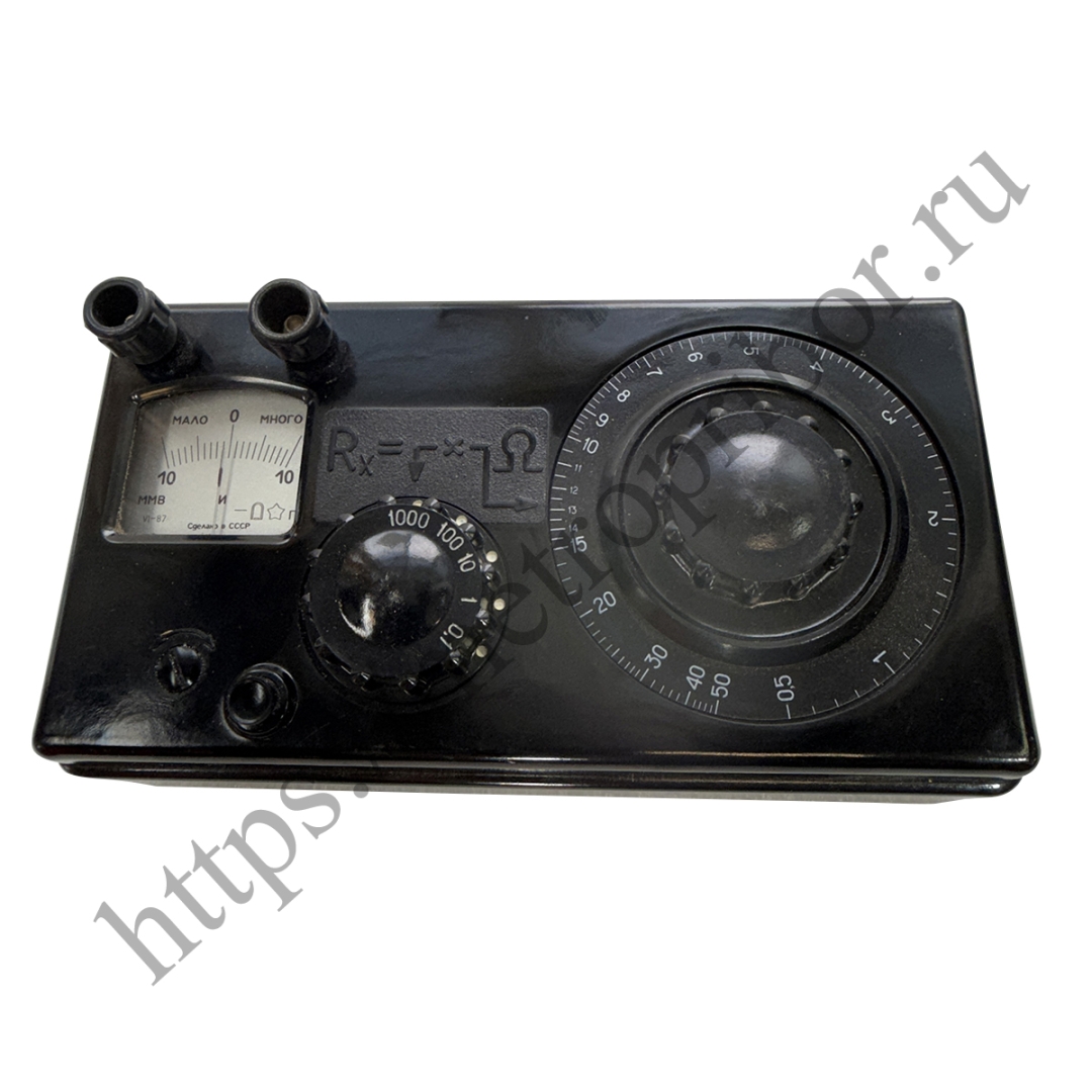 Индикатор сопротивления ММВ (мост малый Уитстона, mmb) Предназначен для технических измерений сопротивления постоянному току проводников первого рода. Пределы измерения: от 0,05 Ом до 5 Ом; от 0,5 Ом до 50 Ом; от 5 Ом до 500 Ом; от 50 Ом до 5000 Ом; от 500 Ом до 50000 Ом Погрешность показаний в зависимости от диапазона: не более ±2,0%; ±5,0%; ±15,0% Индикаторы сопротивления ММВ предназначены для технических измерений сопротивления постоянному току проводников первого рода. Индикатор сопротивления ММВ предназначен для работы при температуре окружающего воздуха от +10 до +35° С и относительной влажности до 80% при +30° С. Технические данные Индикатор имеет следующие пять пределов измерения: от 0,05 Ом до 5 Ом; от 0,5 Ом до 50 Ом; от 5 Ом до 500 Ом; от 50 Ом до 5000 Ом; от 500 Ом до 50000 Ом; Погрешность показаний индикатора ММВ на средней отметке «5» шкалы реохорда не превышает ±2,0% и по обе стороны от нее до отметок «2» и «20» не превышает ±5,0% от действительного значения измеряемого сопротивления при следующих положениях переключателя: «х1», «х10», «х100», в остальных случаях погрешность не превышает ±15%.В положении переключателя кратности «х0,1» на отметках «0,5» и «1» погрешность не нормируется. Время успокоения подвижной части гальванометра не более 4 с. Рабочее положение - горизонтальное. Габаритные размеры индикатора ММВ не более 201x111x65 мм. Масса индикатора ММВ без источников питания не более 1,1 кг.