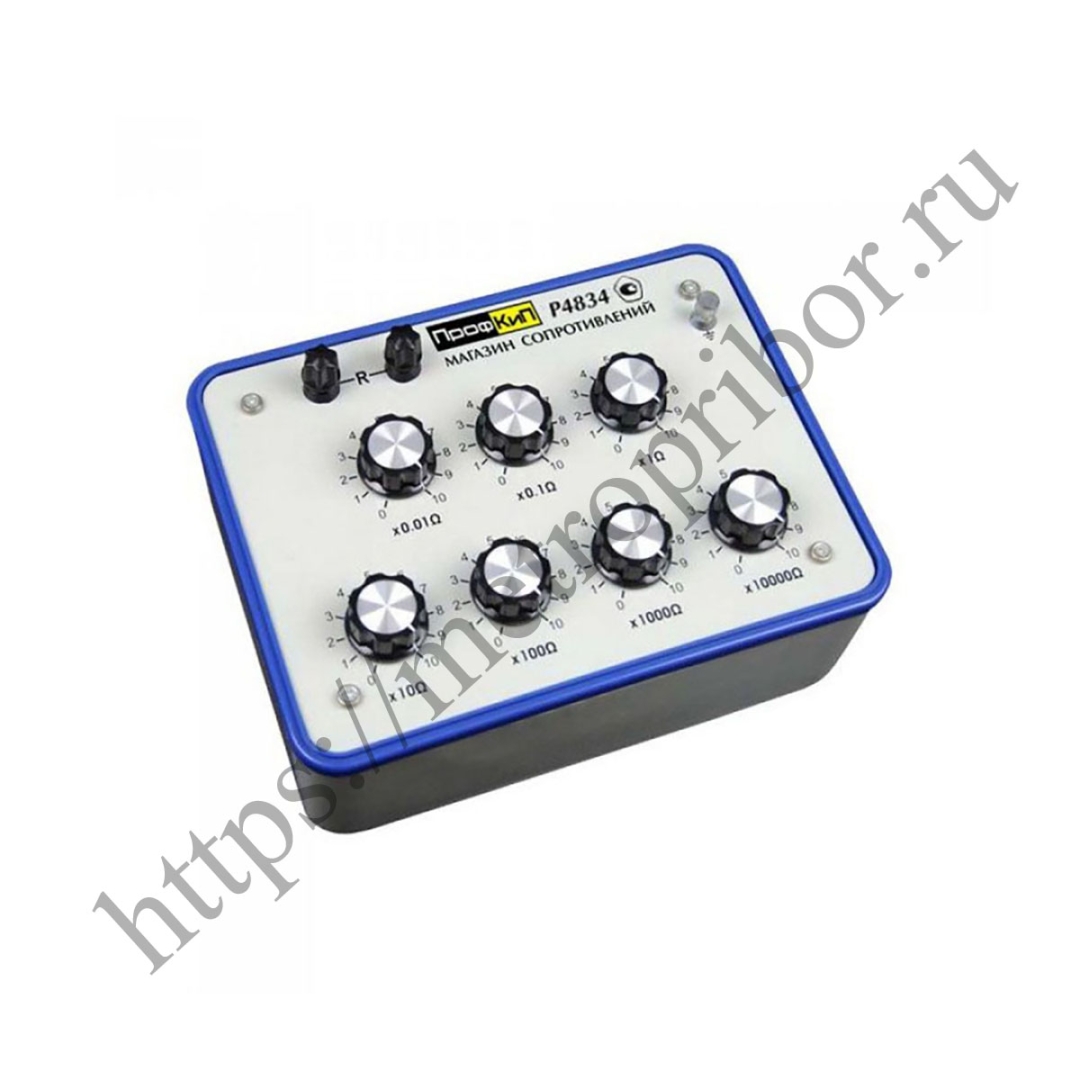 Магазин сопротивления ПрофКиП Р4834 (разработка 2020 года) предназначен для воспроизведения значений электрического сопротивления постоянному току и для применения в качестве многозначной меры электрического сопротивления (ММЭС) в цепях постоянного тока. Принцип действия магазинов сопротивлений заключается в воспроизведении необходимых значений сопротивлений с помощью резистивных элементов. Конструктивно магазины сопротивлений состоят из последовательно соединенных равнономинальных прецизионных резисторов, установленных в каждой декад. Приборы разработаны и выпущены компанией ПрофКиП взамен магазинов: Р4834 (Украина) и ПрофКиП Р4834-М1 (разработка 2012 года).
