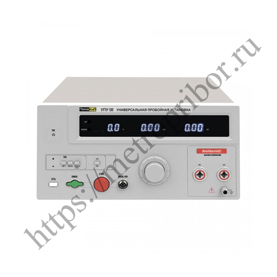 Высоковольтная пробойная установка ПрофКиП УПУ5М предназначена для генерирования напряжения постоянного и переменного тока синусоидальной формы, для проведения испытаний на проверку напряжения пробоя, измерения тока утечки и других показателей эффективности электрической безопасности изоляции силовых кабелей, электроустановок, диэлектриков, средств защиты и т.д. Так же универсальная пробойная установка ПрофКиП УПУ5М может выступать в качестве источника питания высокого напряжения постоянного тока, для проверки характеристик компонентов и приборов.